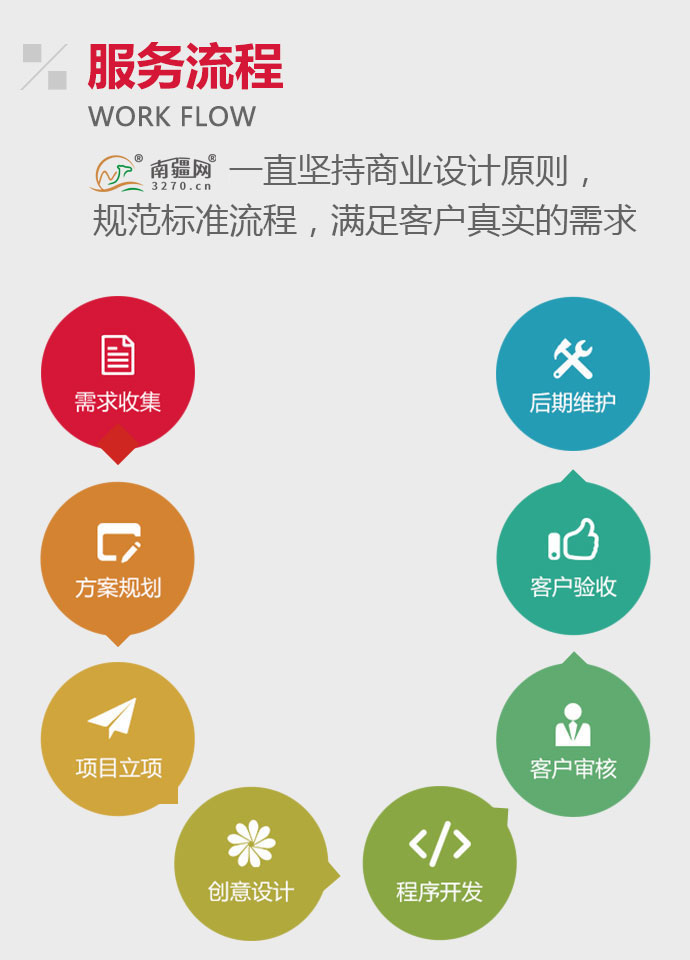 南疆网一直坚持商业设计原则,规范标准流程,满足客户真实的需求;我们按照需求收集、方案规划、项目立项、创意设计、程序开发、客户审核、客户验收、后期维护的标准化流程全方位为客户服务。