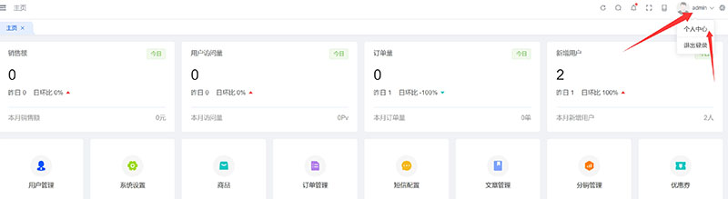 第一步登录平台,点击箭头所示位置管理员账号名称,弹窗中找到个人中心点击进入