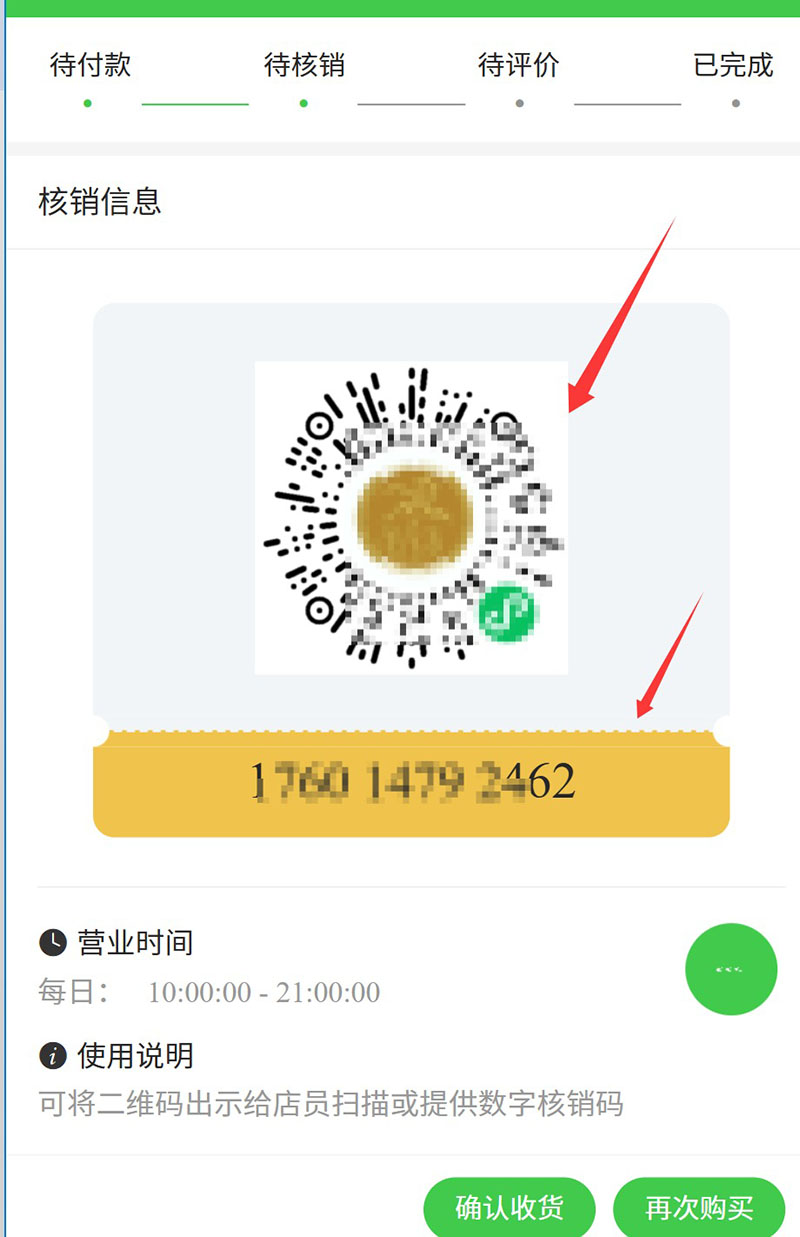 核销码商户可以进行核销,核销方式如箭头所示,要么直接扫码,要么输入核验数字进行核销;