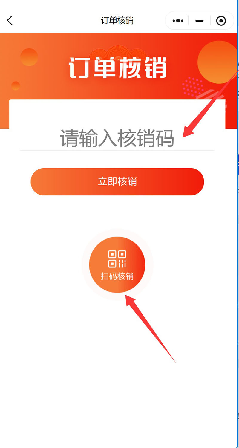 如下图,商家核销的两种方式。第一个箭头就是商家输入用户的核验码;