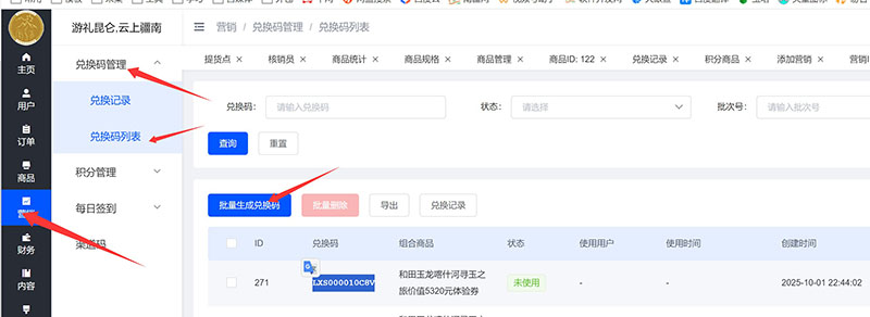 1、管理员登录管理员后台,如下图所示生成兑换码