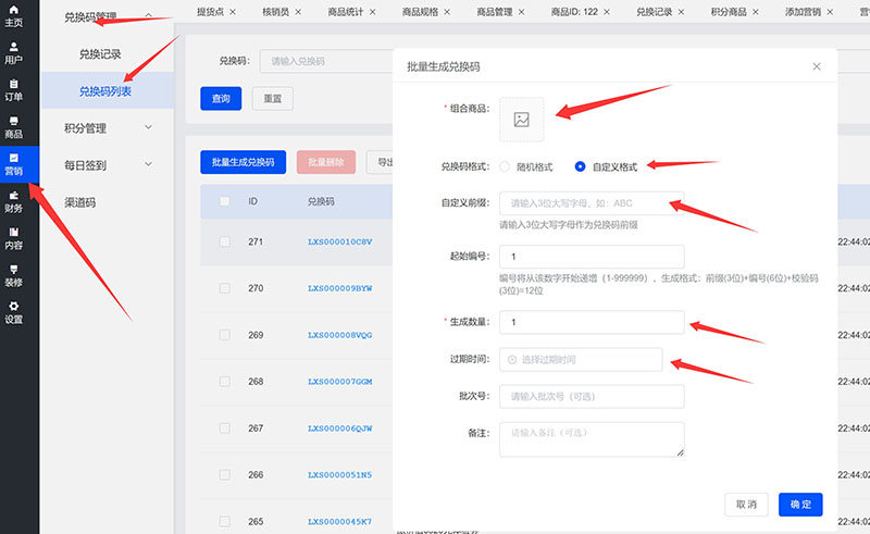注意下图所示箭头,首先要注意选择组合商品,也就是生成的兑换码是匹配对应的组合商品的,如果选错了组合商品,那么兑换的就会不正确。牵涉线下实体券,错了券就全部无效了;