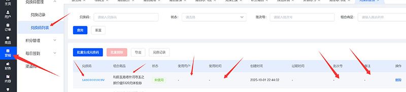 如下图,兑换码是哪个被兑换了,被谁兑换了,兑换的商品是什么,什么时间兑换的,批次号和备注信息是什么都能方便的显示