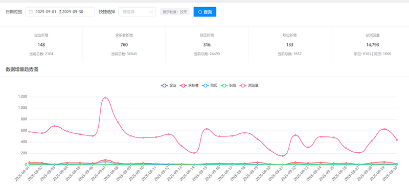 【功能新增】以曲线方式按天显示数据新增趋势图;【功能新增】以天的方式显示每月的企业、求职者、职位新增、浏览量新增等直观数字,方便调用和统计。