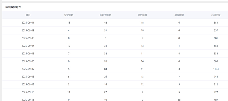 【功能新增】以天的方式显示每月的企业、求职者、职位新增、浏览量新增等直观数字,方便调用和统计。